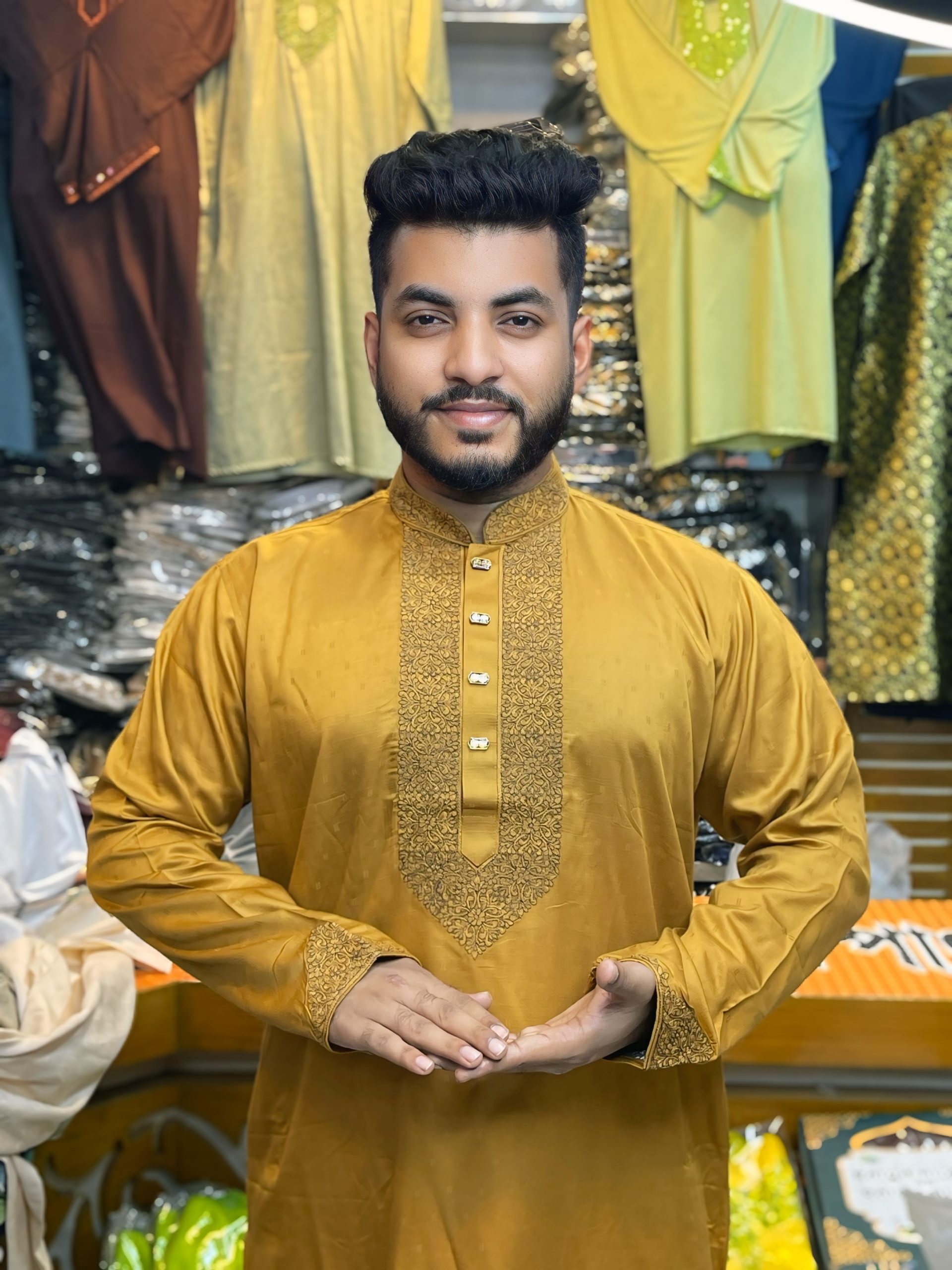 • চমৎকার এম্ব্রয়ডারি কাজ: পাঞ্জাবির ডিজাইনে রয়েছে চমৎকারভাবে করা ডাবল ডিপাস এম্ব্রয়ডারি কাজ।
